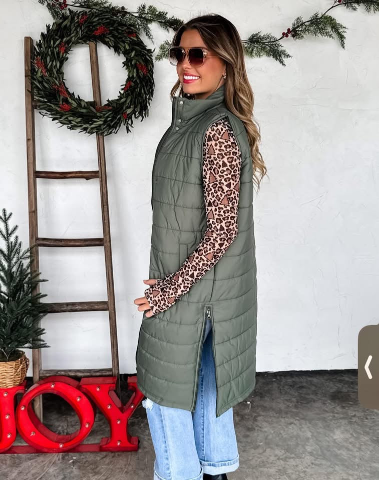 Stay warm and stylish in this long black puffer vest — the ultimate cold-weather layer. Designed with a sleek puff finish, this vest features a zip-front closure with snap buttons for extra coziness, a roomy hood for added warmth, and side pockets to keep your hands toasty. The longer length offers extra coverage, making it perfect for layering over sweaters and flannels on chilly fall days.