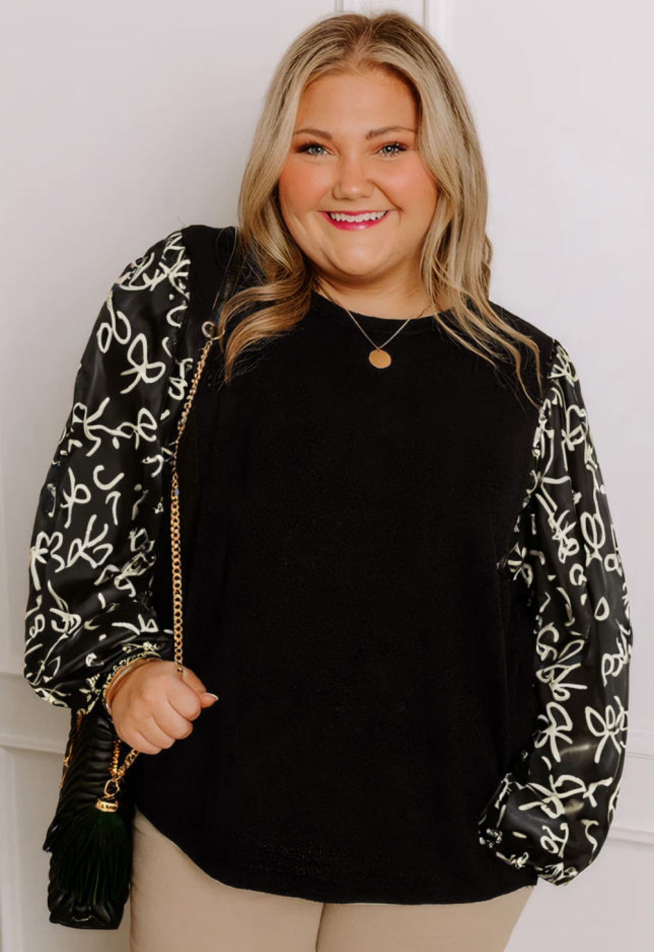 - Features satin balloon sleeves adorned with a gold bow print.