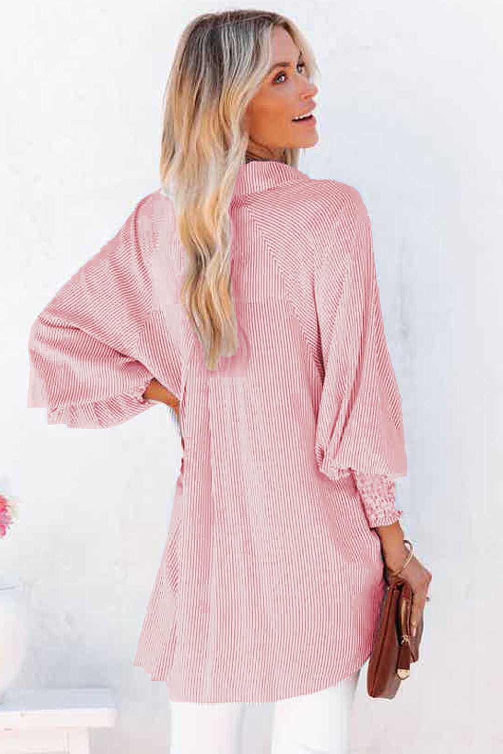 - Turn-down collar, long sleeves with smocked cuffs, bust pocket and front button closures