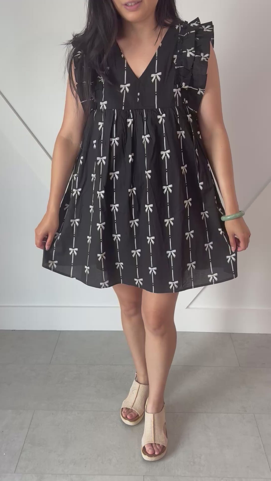 Sweet meets sophisticated in this knee-length black dress with white bow accent pattern and a touch of gold glam. 🖤🎀✨