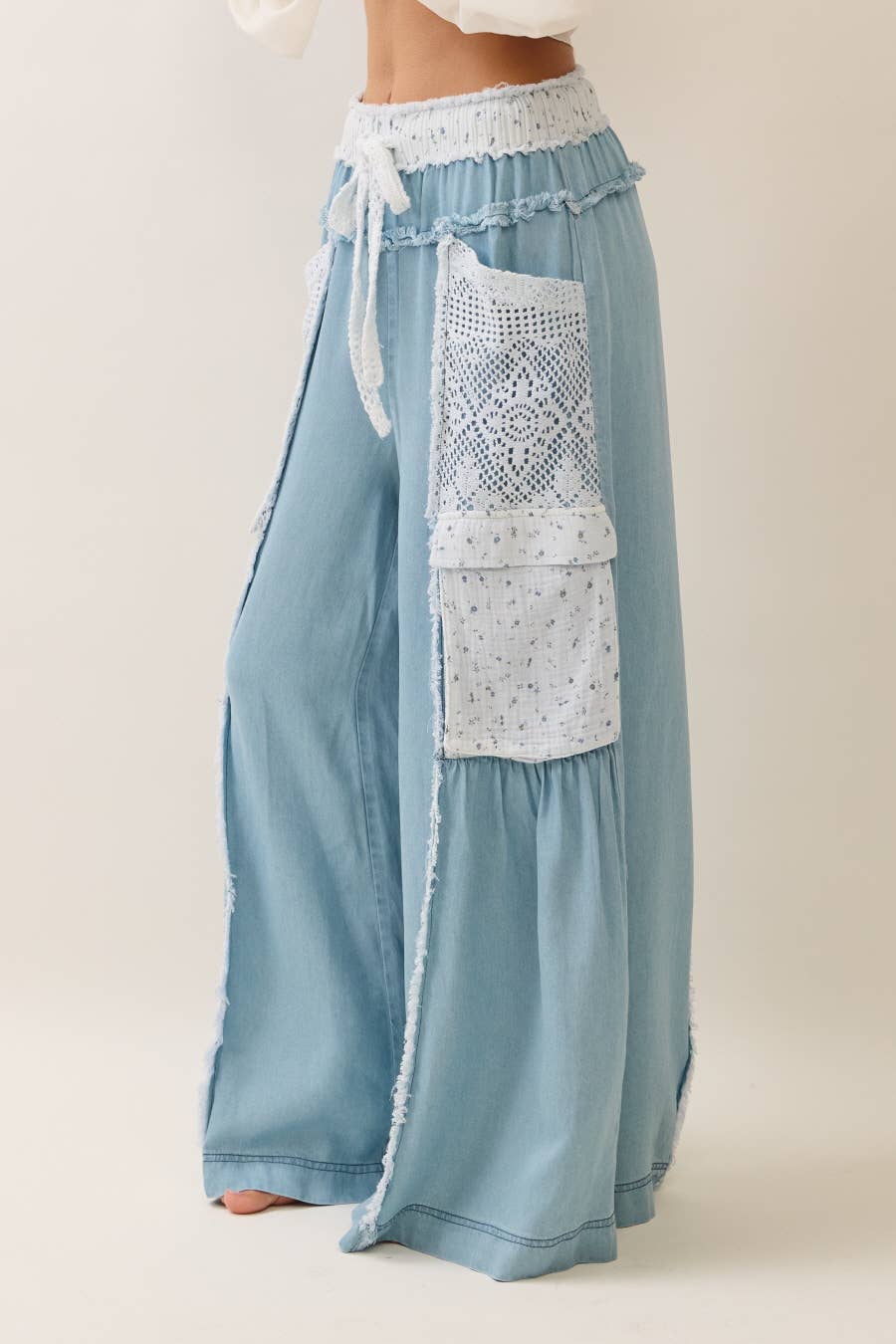 Pull-on maxi pants with lace patch pocket. Also available in sizes 1XL to 3XL: Total Length: 40" Self: 100% Tencel, Cont: 65% Cotton, 35% Polyester