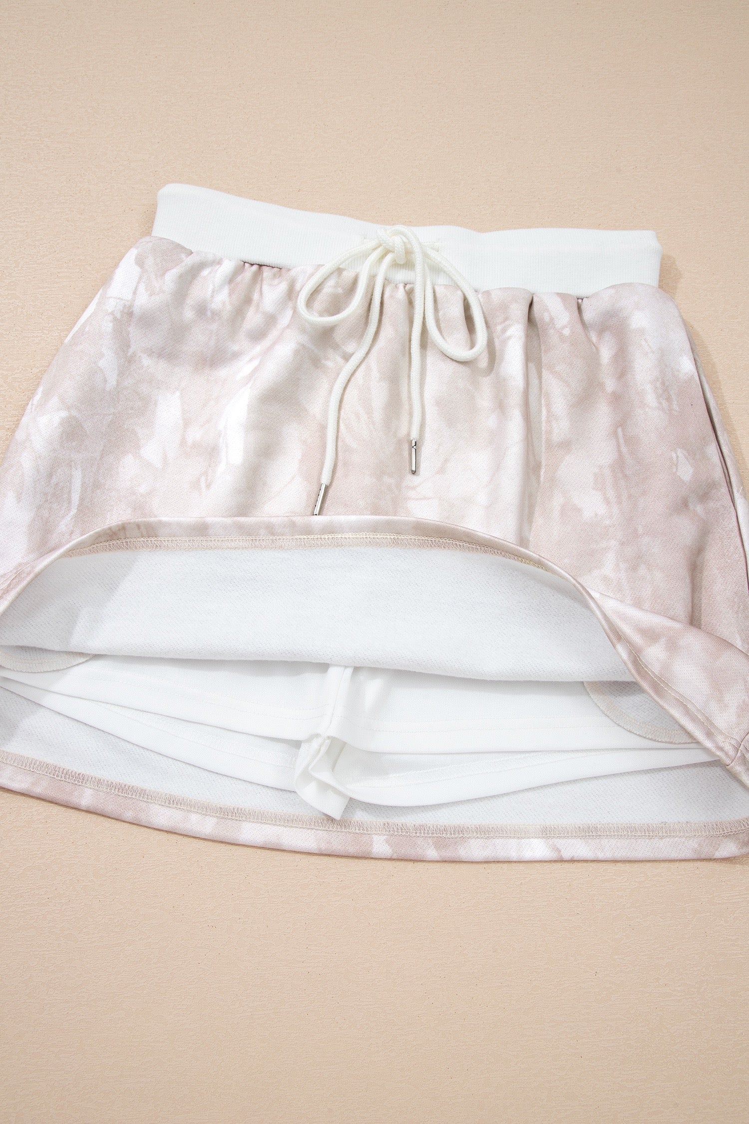 Adjustable drawstring mini skort offers flexible fit and flattering shape.